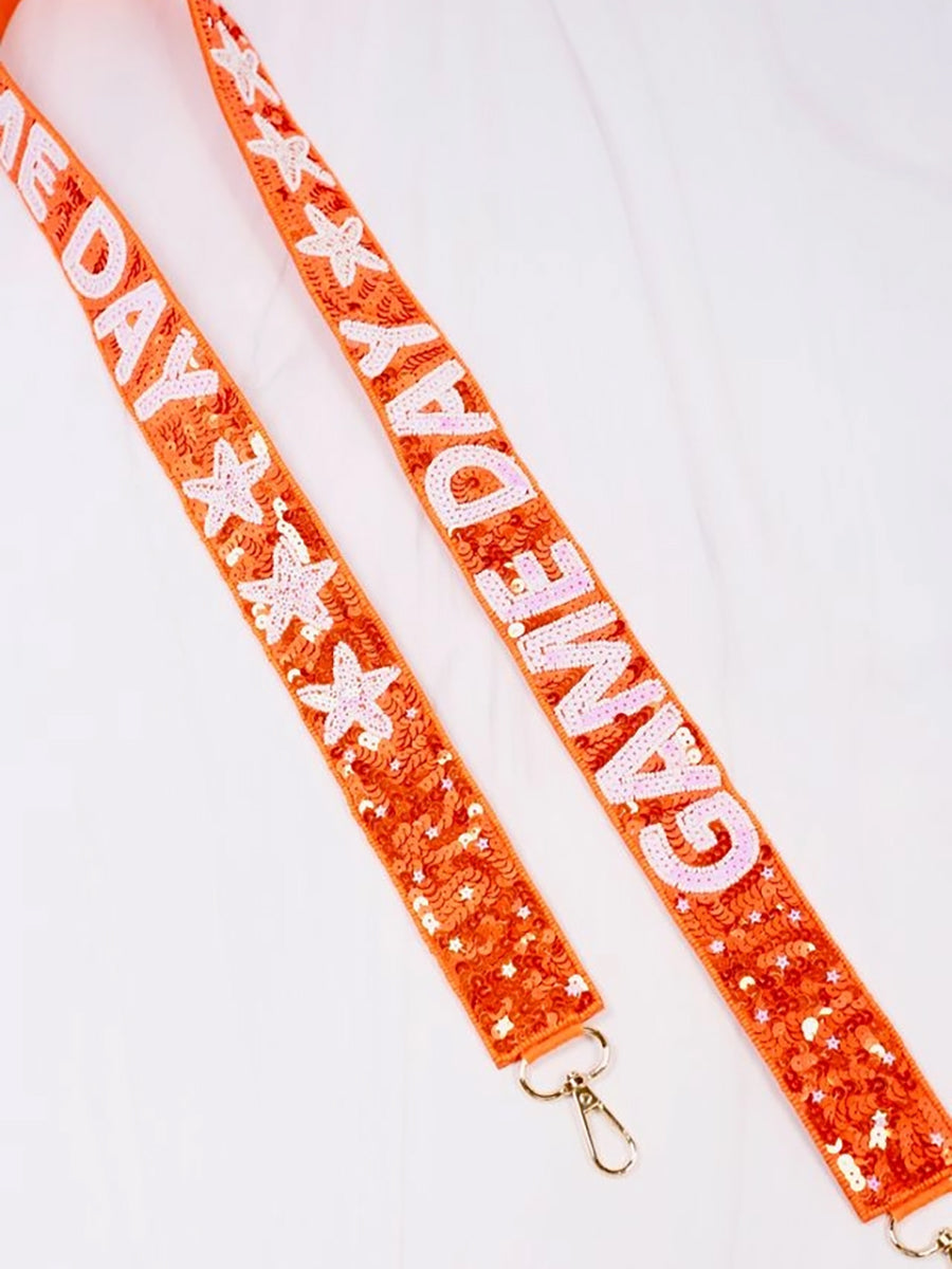 - "Game Day" in white with orange sequin strap