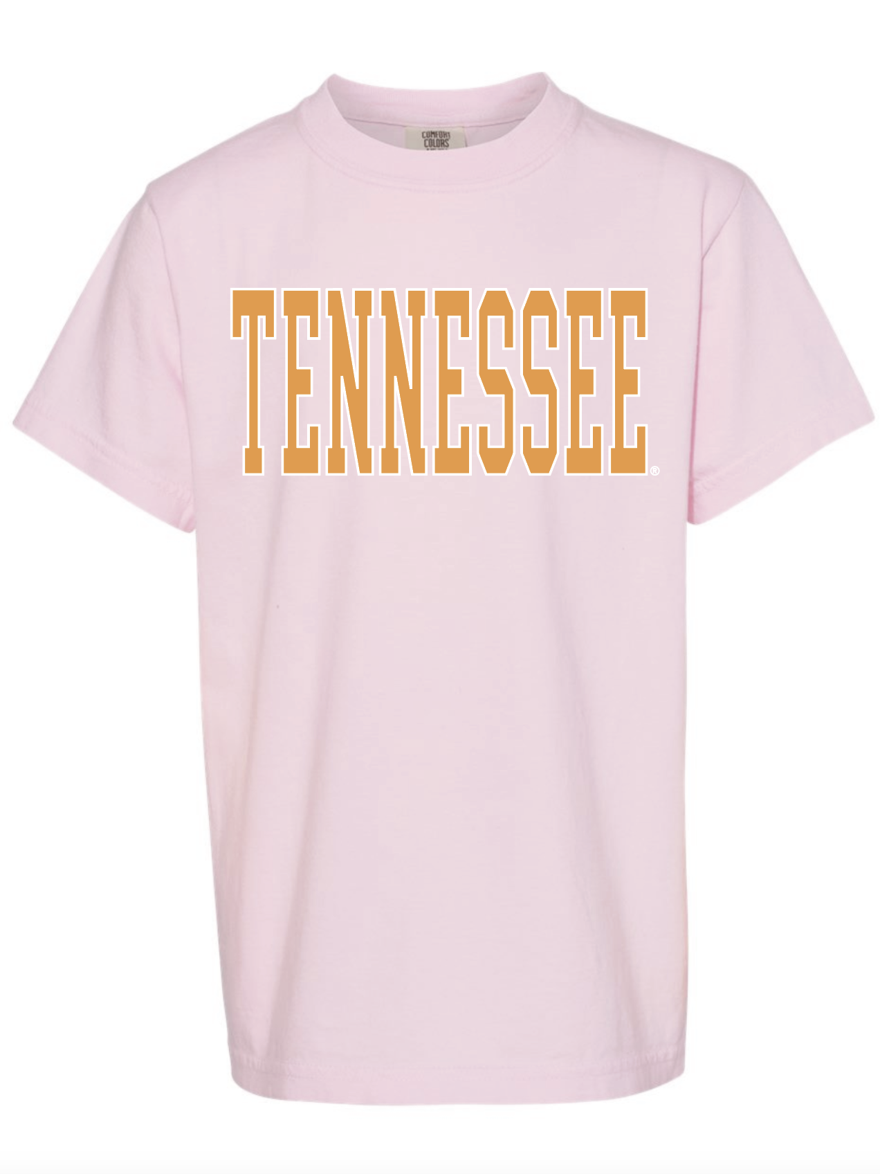Brighten up your young Vols fan's wardrobe with this charming Kids Pink with Orange "Tennessee" T-Shirt. The light pink base offers a fresh twist on traditional team colors. Bold orange TENNESSEE letters, outlined in crisp white, pop against the pastel background.