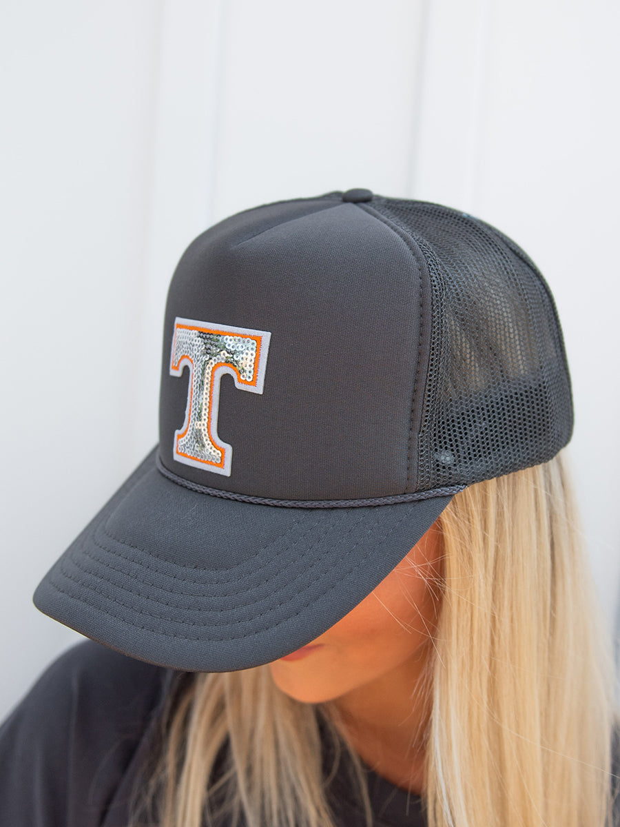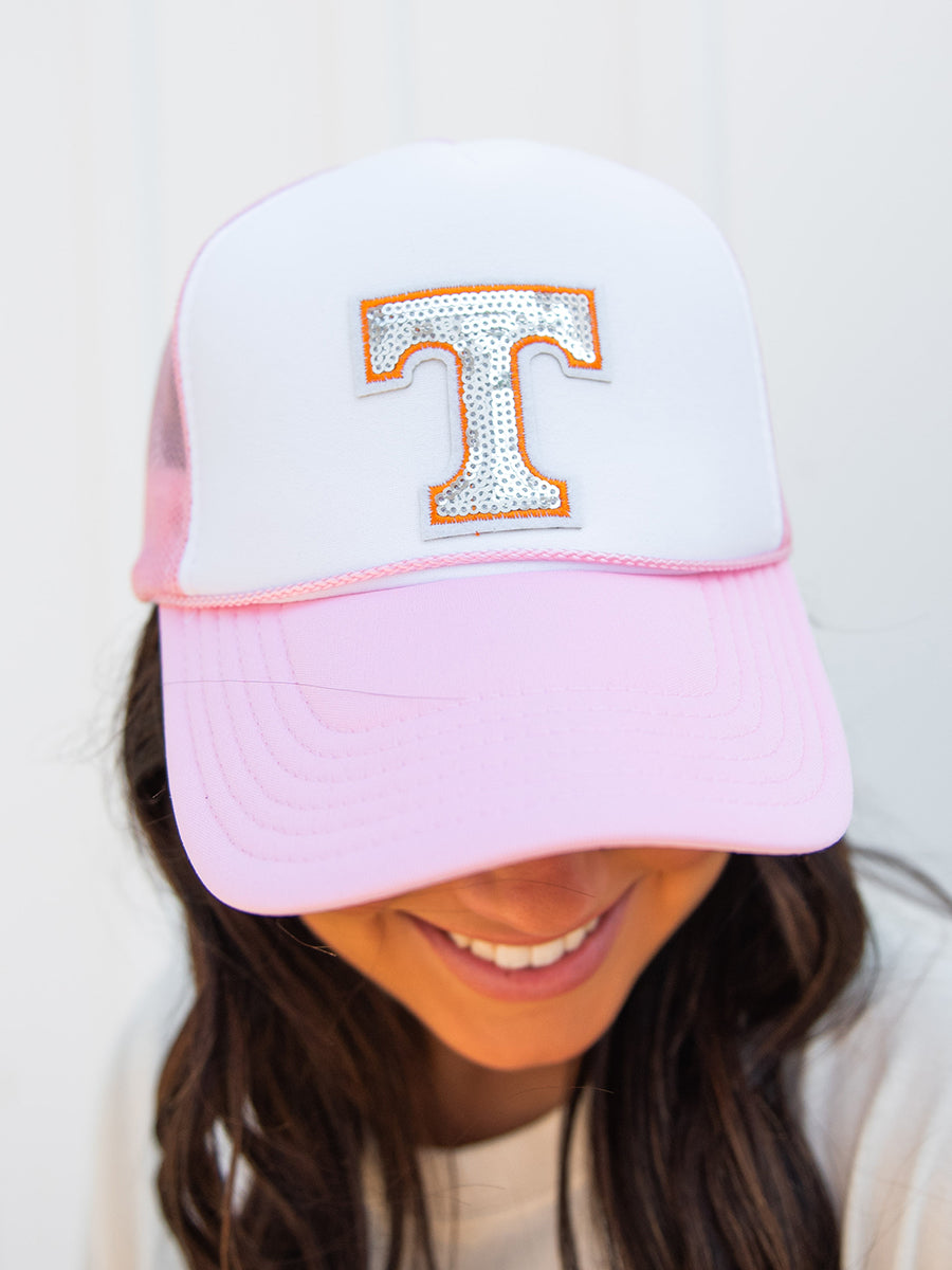 Add sparkle and personality to your game day outfit with our Sequin "Power T" Patch Trucker Hat! Offered in three styles, it features a shiny patch with an orange outline accent. The Power T sits proudly on a black mesh back cap, or charcoal grey. For a girly look, go with the pink and white model.